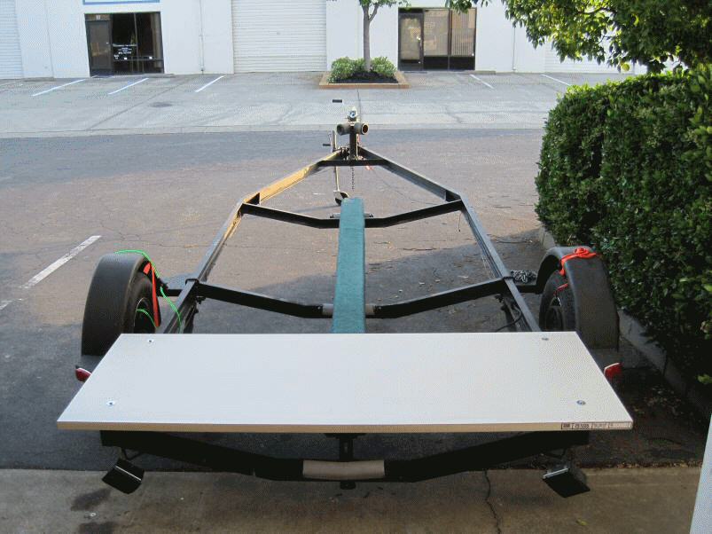 The solution was to buy a used long sailboat trailer and deck it with lightweight hollow core panels. The decking is on, now we need to make a ramp and tie down points. In addition to use for the Tandem the trailer will be used to get the Sky Pup chase plane to the airport. The whole cost? About $600. This compares well against the $1,200 for one time use truck rental.