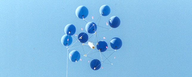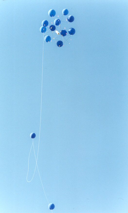 We did some small scale platform tests back in 1999. Remember when that year sounded like the future? The platform is about fifteen feet across. The blue balloons were used for these low altitude tether flights. This test was a preliminary run for Away 5, our first free flight platform mission. To simulate free flight we supported the tether with balloons. This kept the weight of the line from pulling on the platform.