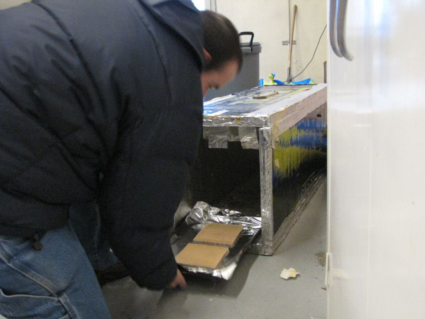 Neither rain, nor snow, nor freezing cold shop… or some thing like that. In spite of the icicles on our chins we built, glued and made noise today. We are going to experiment with several different material designs for the next round of MHD tests. We made segmented plates and baked epoxy onto porcelain for the next round. We finished off the three fan units in the crew module mock up. We got to hear first hand how fan noise is a critical problem in life support systems, even with very quite fans. All the repair are complete with the chase plane so we pulled her outside to see if we could fired her up. With a few pull the engine roared to life. She feels like shes wants to fly.
