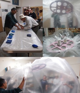 We’ve begun testing the upper deck balloon interface. This system will be used by Ascenders and Dark Sky Stations.It does two things: It allows multiple easy interfaces to the inner lifting cells (this was a huge problem on Ascender 175) and it allows us to use inexpensive flat plastic film instead of outrageously expensive thin film shaped balloons. The test cell/balloon was half scale for both the next Ascender and the next DSS. Yesterday the team began building a full scale cell to test.