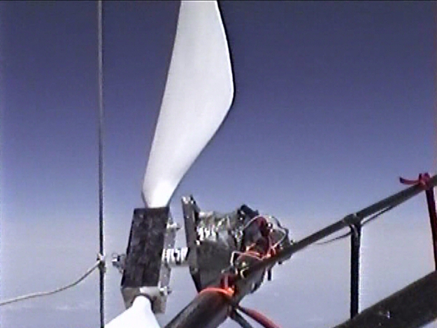 This was a very successful mission that had a bit of an adventure on landing. It was carried aloft by six balloon. It descended for a “soft” landing riding three balloons down. We tracked it all the way to touchdown. It landed hard on a ridge. When we got to the landing site, the propeller and motor were there, but the rest of the vehicle was gone. Without the weight of the motor and prop it had taken off again. Only this time with a dead telemetry system.