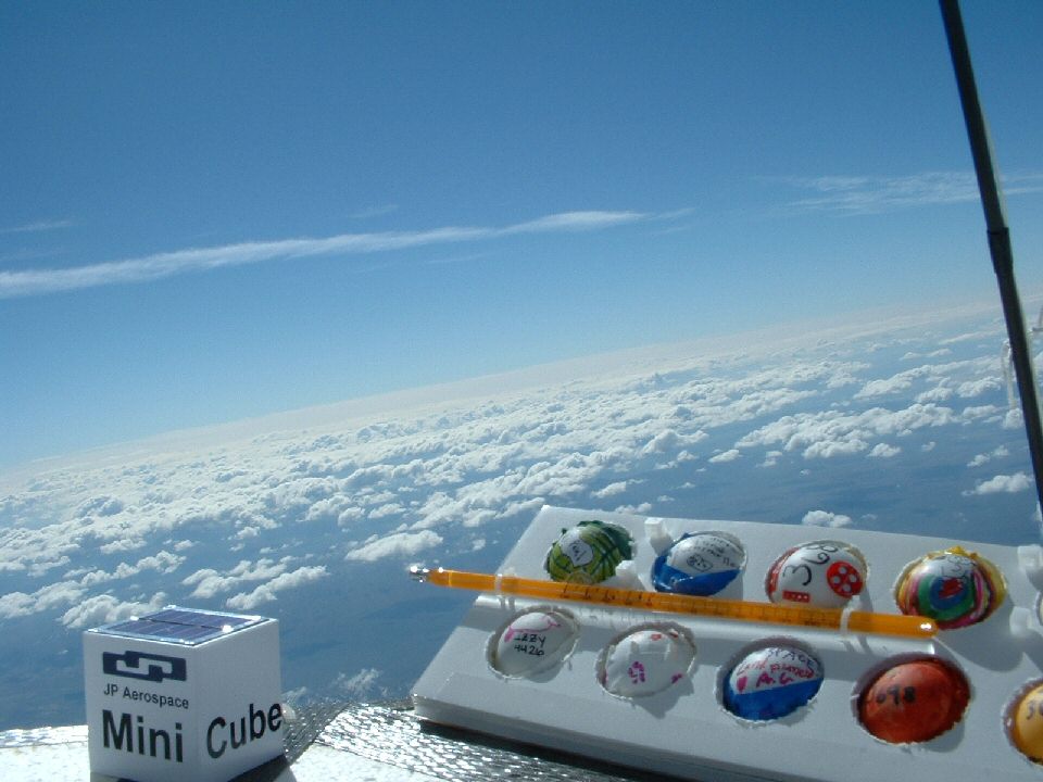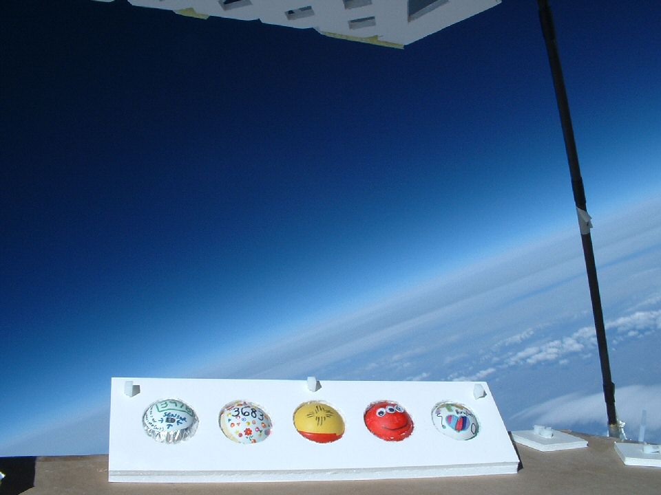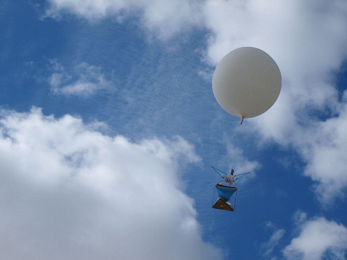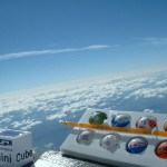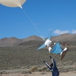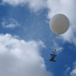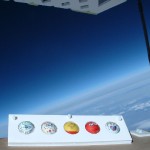 April 13th, 2011Away 48 made an appearance in the cameras of Away 49. They were a few miles apart when the faster climbing Away 49 overtook Away 48. Away 48 shows up about six times in each of Away 49′s five cameras. We can tell it’s Away 48 from top to bottom travel through the course of the images, and the fact the appearance coincides with the altitude of the rendezvous. The balloon is about 54 feet in diameter at this level.