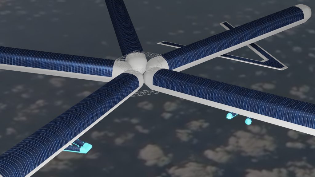 Dark Sky Station. Outpost at the edge of space. The big V is the “Ascender H1″, station to orbit vehicle. The smaller V are the “Load” Airship, ground to station.