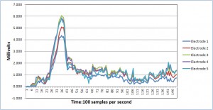 February 18th, 2014Today we got the system for measuring the speed of the wave in the shock tube working. We will be able to measure speed in the tube up to Mach 3. The chart is from a test run of the instrumentation. It wasn’t measuring waves but rather me smacking it with a pen. Tomorrow it gets installed in the tube.