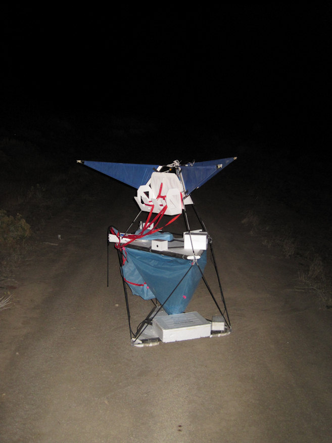 The hunter called and left a message with us. He then tied MeToo off to a rock with the broken balloon line to keep her from flying away. She was still bobbing along up to ten feel off the ground. After he left METoo made one last flight moving twenty feet over to the the center of the road. Eight seconds later the backup balloon release activated. METoo was finally landed with the balloon now twenty feet away, fifty feet in the air still tied off to the burst balloon at the rock. Kevin and I just had an interesting time crawling up a wash in the dark try not to lose the truck in the stream when we got back on solid ground and rolled up to find METoo just waiting for up on the mountain top looking like she was ready to fly again.